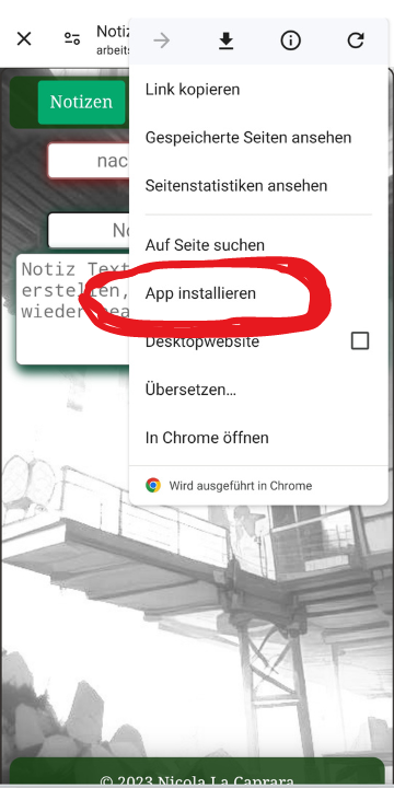 Man kann die App als Progressive Web App (PWA) installieren, indem man hier wo die 3 Punkte sind, einfach drauf klickt, und am besten mit dem Chrome-Browser ins Internet geht.