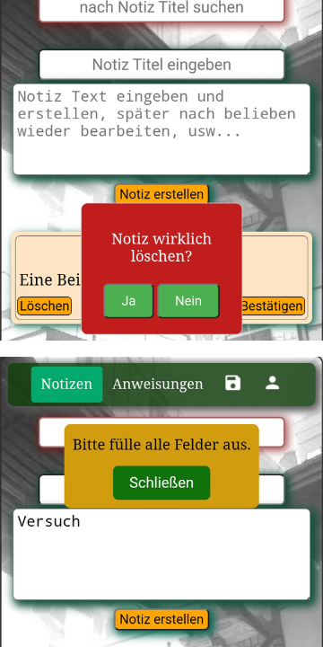 hier habe ich 2 unterschiedliche Bilder der App, welche aufzeigen, was für Meldungen erscheinen, wenn man eine Notiz löschen möchte, oder beim Erstellen der Notiz vergessen hat einen Titel oder Notiztext einzugeben