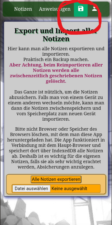 Hier kann man alle geschriebenen Notizen (nur zusammen) in einem Ordner außerhalb der App abspeichern und somit Back-ups erstellen.