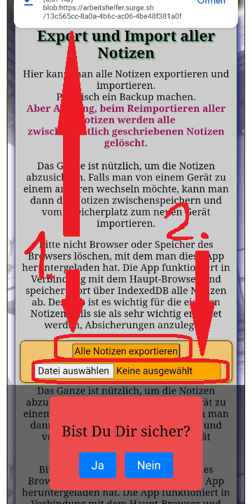 Danach kommt man wieder zur App und rechts vom Button "Datei auswählen" erscheint die Bezeichnung der ausgesuchten Datei. Und es erscheint eine Warnmeldung, bevor man die geschriebenen Notizen endgültig mit den neuen Notizen überschreibt. Wenn man auf Ja klickt, werden alle Notizen der Json-Datei übernommen.