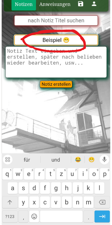 Der mittlere Feld ist für den Titel der Notiz. Später kann man dann über den oberesten Feld z.B. diesen gerade auf dem Bild verwendeten Titel eingeben. Und dann wird die gesuchte Notiz über die genaue Eingabe des Titels gefunden.